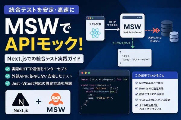 MSWとは?統合テストでAPIモックを行う方法|Next.js対応で徹底解説作成日: 2026年4月29日·1899 文字·4 分Next.js MSW テスト Jest Vitest TypeScriptAPI通信を伴うテストの不安定さを解消するMSW。Next.js環境でのセットアップから、実務に即した高度なモック手法、App Router特有の注意点まで、テストの信頼性を高める知見を凝縮しました。